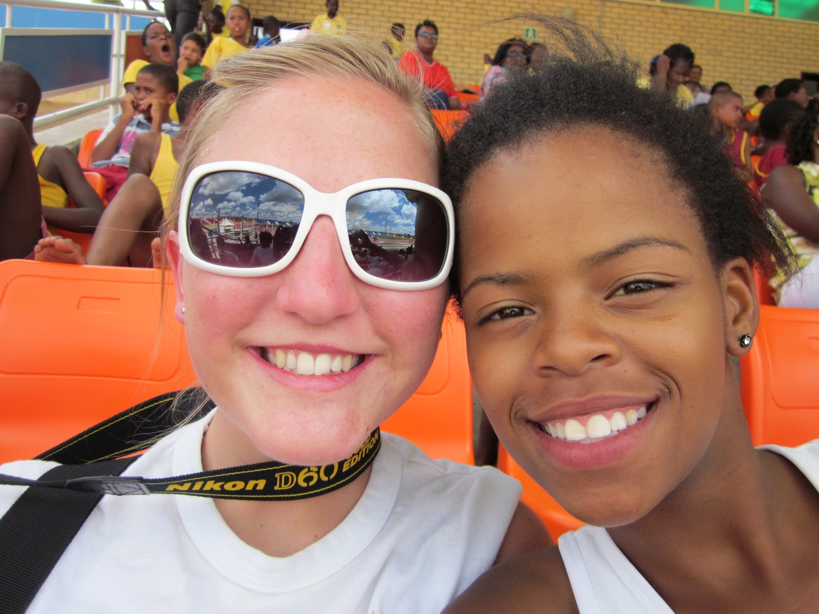 Thursday was a memorable day filled with athletics, fun, food, and sun. The learners along with the teachers had been preparing for this day for many weeks. There were many class periods missed and long hours spent in preparation for this day. With my sign all made and my white PLU shirt and royal blue nike shorts on, I was ready for the day. The whole day was incredible and full of surprises starting with the moment our taxis arrived in the morning. We were greeted with two small taxis this morning which was interesting because we had five people going to athletics and only three going to the school. So 6 of us squished our way into a car intended for 5 and off we went. We arrived at the stadium just as the sun was peaking up over the horizon and the first load of our Steenkamp learners were pulling in in the little white school bus. To my delight, the first group was filled with my cheerleader girls who were all decked out in matching outfits and pom-poms with spirits high ready for a day of joyfully cheering on their classmates.